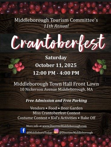 Middleborough Tourism Committee announces the 10th annual Crantoberfest to be held Saturday October 11, 2025 at the Middleborough Town Hall 10 Nickerson Ave from noon to 5:00 p.m. Free admission and free parking. Events include the great Cranberry Bakeoff.